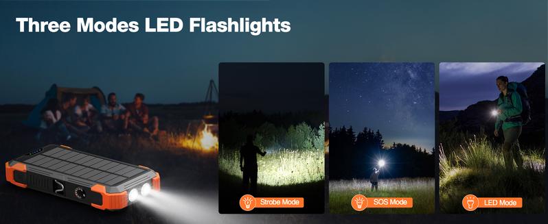 This solar battery pack is well made to be Waterproof/Shockproof/Dust-proof, which can withstand the harsh environment outdoors. It’s equipped with Dual super bright LED lights, a Must-Have tool for outdoor activities and home emergencies.