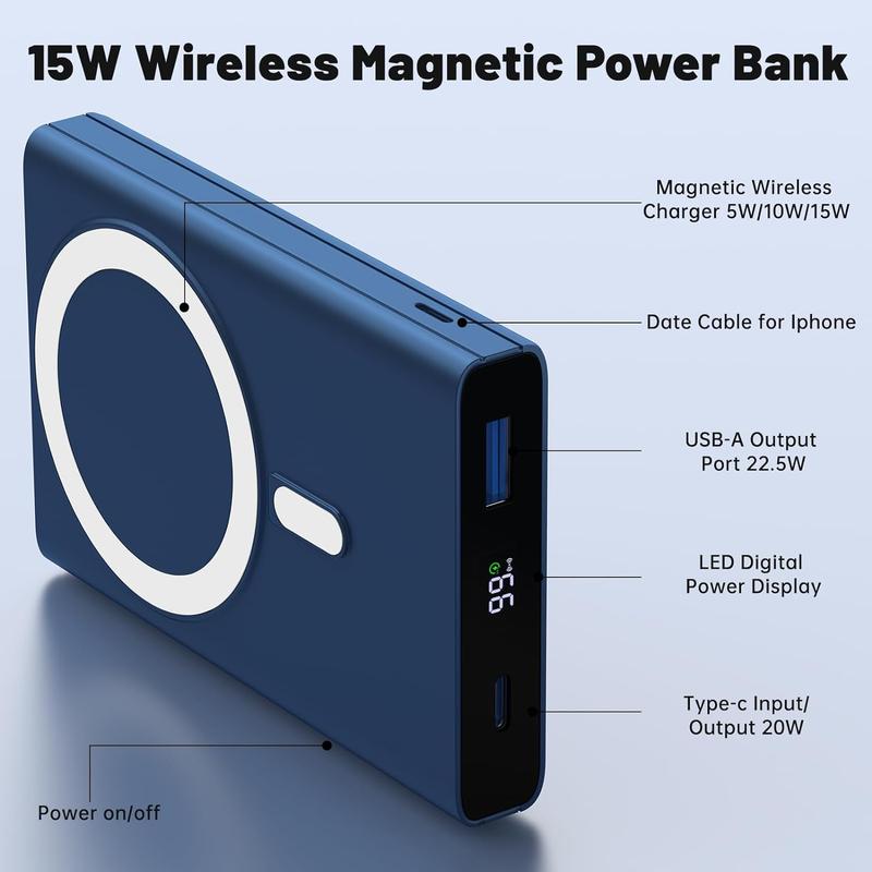 Wireless Charging Power Bank, 10000 Mah Power Bank with Folding Stand and USB-C Cable LED Display, Magnetic Power Bank 22.5W PD Fast Charging for Iphone